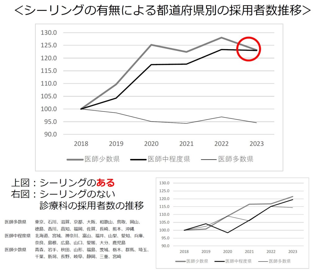 シーリングのある診療科では医師多数県における採用者数が抑制され、医師少数県、医師中程度県における採用者数が増加しています。この間の医師国家試験の合格者数は増加傾向ですので、シーリングによる診療科、医師多数県での採用者数増加の抑制効果はあると考えられます。シーリングのない診療科では医師多数県、医師少数県、医師中程度県のいずれにおいても採用者数が増加しています。