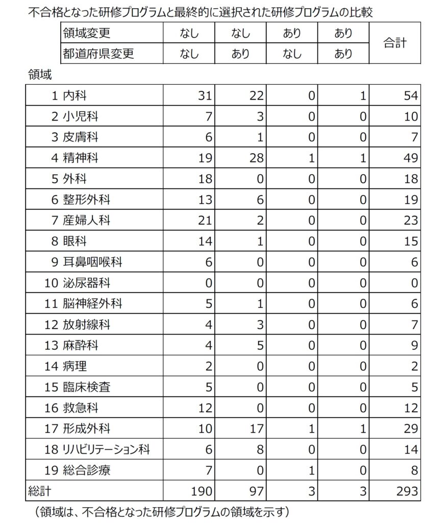 基本的には研修プログラムに不合格となっても都道府県と基本領域を変更しない場合が多く(64.8%)、都道府県のみ変更した者(33.1%)の中にはシーリングの関係で都道府県を変更せざるを得なかった者が含まれている者と思われます。