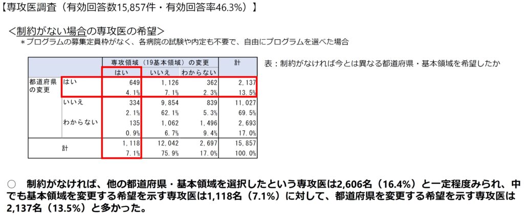 その中でも専門研修病院の都道府県を変更したいと考える専攻医が13.5%、基本領域を変更したいと考える専攻医が7.1%であり、アンケート調査の結果からもシーリングが専攻医の専門研修プログラムの選択に影響を与えていると考えられます。
