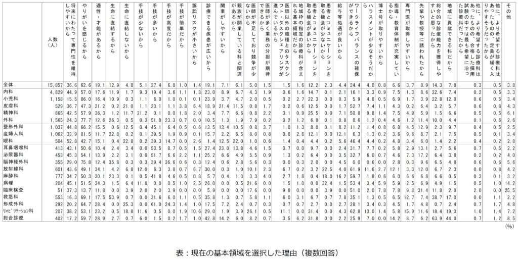 さらに「医師不足地域での医療に貢献できるから」 (3.6%) を選択する医師も一定数存在します。地域医療の現状を理解し、医師不足の地域で貢献したいという強い意志を持った医師がいることを示しています。