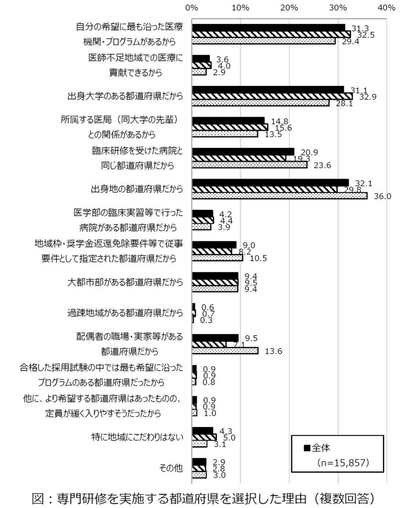 専門研修を行う都道府県の選択は生活環境や将来のキャリアプランにも影響を与える重要な要素です。このアンケート結果によると、「出身地の都道府県だから」という理由が32.1%と最も多く、出身地への愛着や慣れ親しんだ環境で研修を受けたいと考える医師が多いものと推測されます。