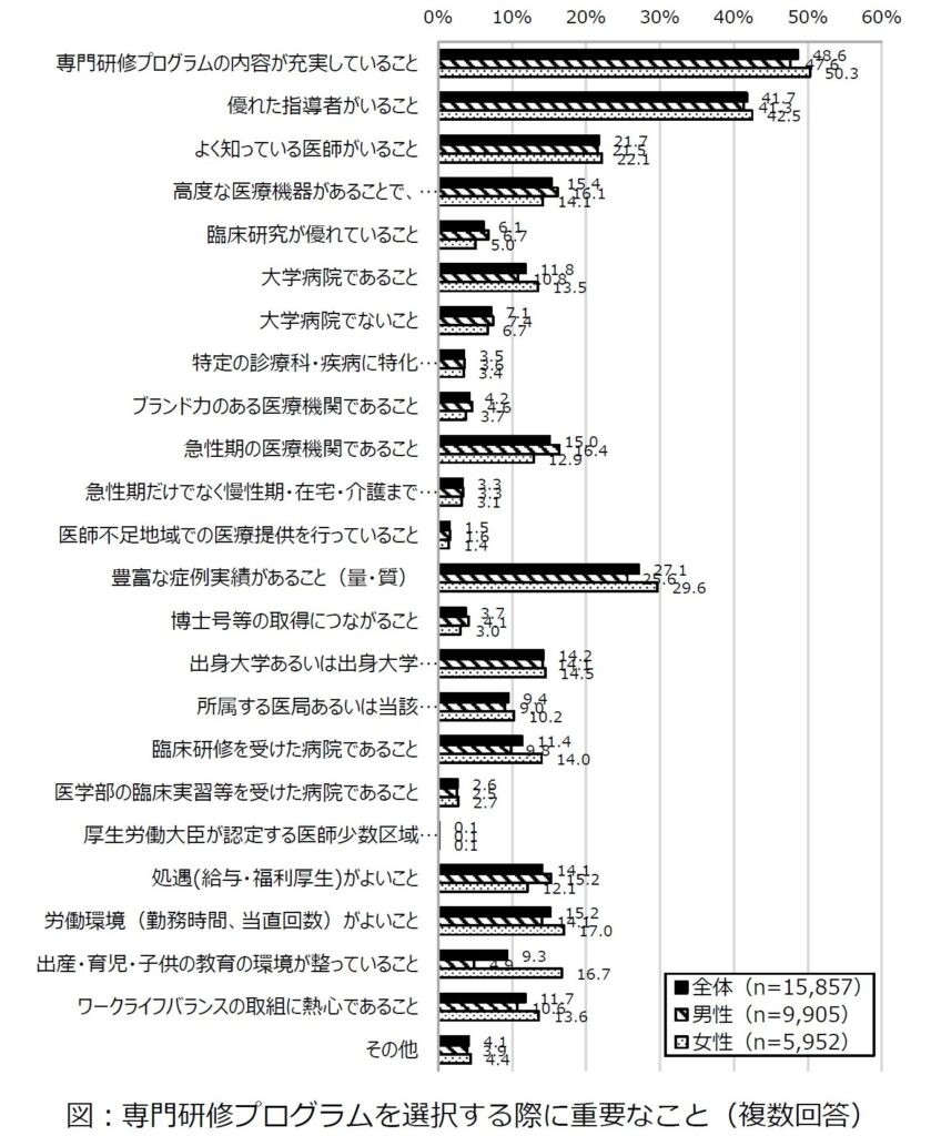 次に重視されているのは「優れた指導者がいること」 (41.7%) です。指導医の量や質は専門研修中の成長に大きな影響を与えるため、経験豊富な指導医のもとで研修を受けたいと考える医師が多いと考えられます。