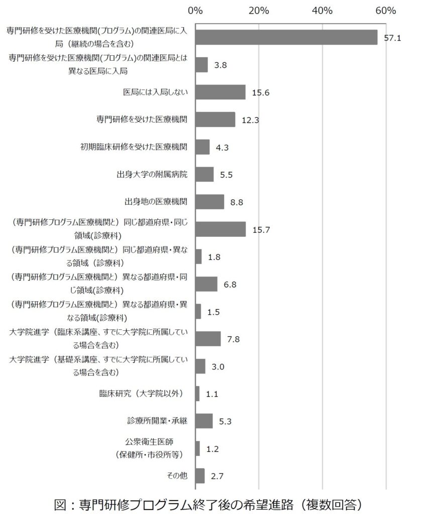 プログラム選択は将来のキャリアパスにも影響を与えます。このアンケート結果では専門研修修了後の希望進路として「専門研修を受けた医療機関の関連医局に入局(継続の場合を含む)」が57.1%と最も多く、研修を受けた医療機関でキャリアを継続することを希望する医師が多いことが分かります。