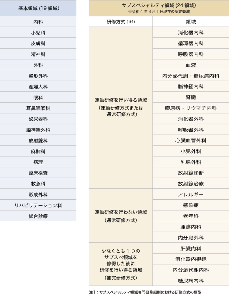 日本専門医機構が認定している基本領域の専門医は下記の19領域であり、日本専門医機構が認定しているサブスペシャリティ領域の専門医は下記の24症例になります。